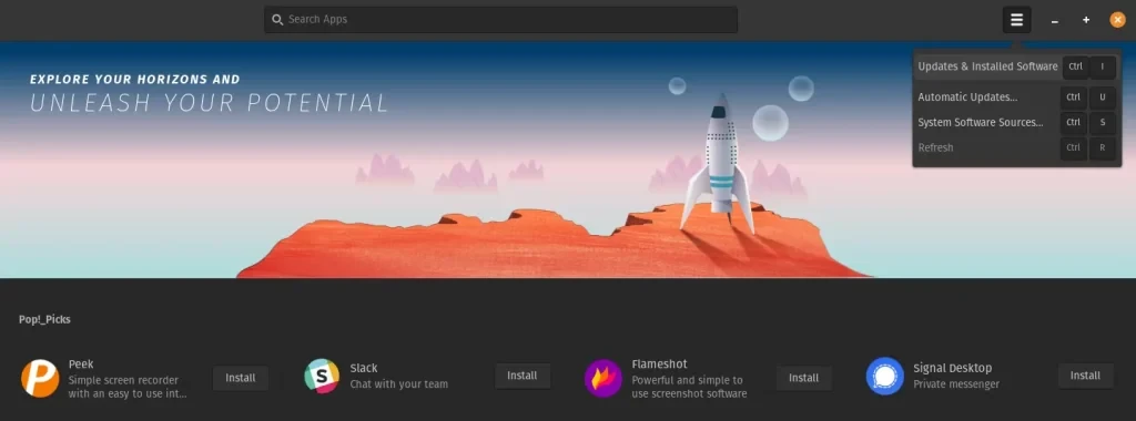 Pokud používáte operační systém Pop!_OS na svém počítači nebo notebooku, pro aktualizace se zaměřte na aplikaci Pop!_Shop. V této aplikaci najdete v pravém horním rohu podmenu, které vás přímo přivede k sekci aktualizací. Zde můžete snadno aktualizovat jak celý systém, tak jednotlivé aplikace.